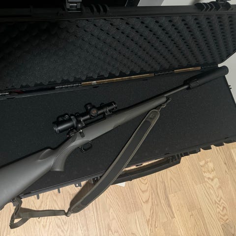 Dette er en Mauser M12 som det er montert en GRS stokk på. Den ble beddet av våpensmed på Moi samt så ble den gjenget opp til Lyddemper.