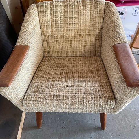Ellers er de veldig gode å sitte i, med grei stand på fjærer og polstring. Armlenene og beina er nok malt/lakkert av forrige eier, vet dessverre ikke om det er teak under eller annet treverk.