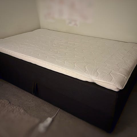 Stort sett brukt til gjesteseng, permanent det siste året med overmadrass. Alltid brukt madrassbesyttelse under lakenet.