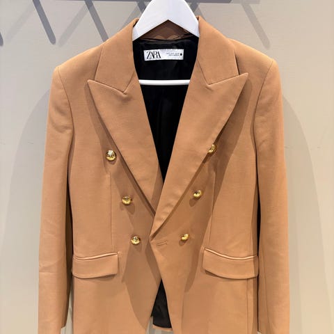 Dobbeltspent modell med dekorative gullknapper og strukturert stoff som gir et eksklusivt uttrykk. Perfekt både til jobb, pent bruk og styling med jeans eller dressbukser.