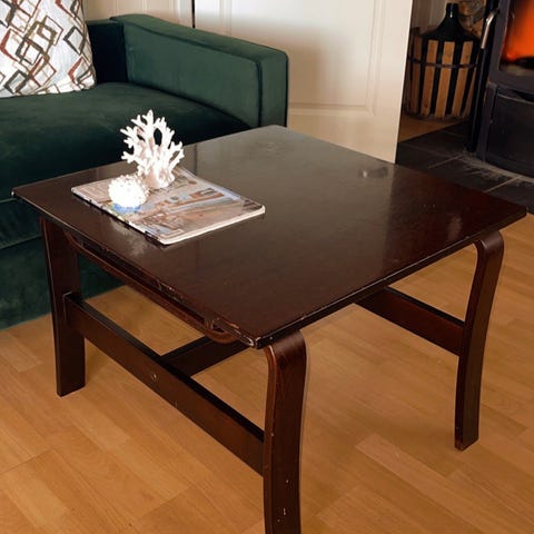 Pent og solid sofabord i tre selges. Bordet har en glatt og blank overflate, stødig konstruksjon og et klassisk uttrykk med dreide ben og fine detaljer.