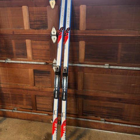 Atomic Mountain Touring BC er et par langrennsski med rød og blå farge. Skiene har bindinger montert for bruk i fjell og turløyper.