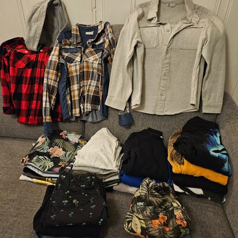 Klespakke hverdagsklær gutt 8-9. Enkelte plagg er i litt større størrelser (de langermede genserne), men alt er brukt samtidig.