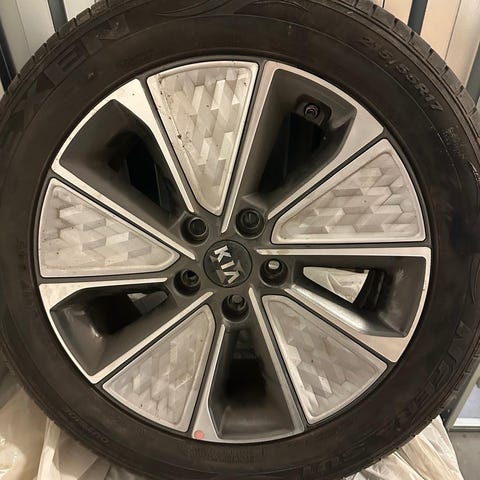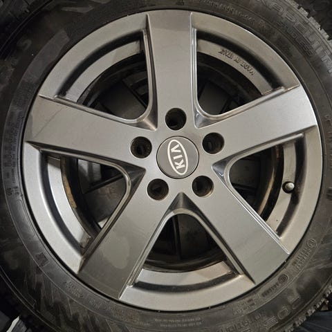 Komplett hjulsett med originale Kia Soul EV felger fra en 2016 modell.