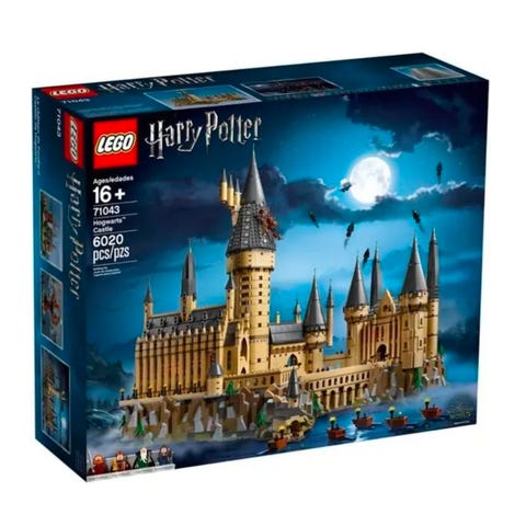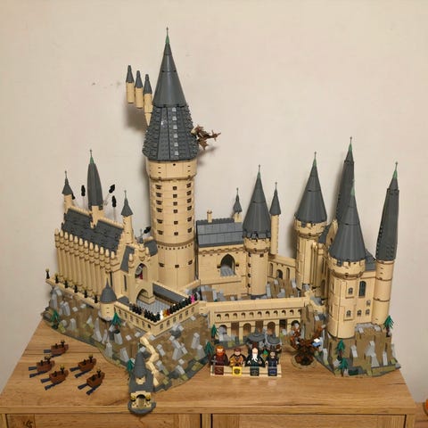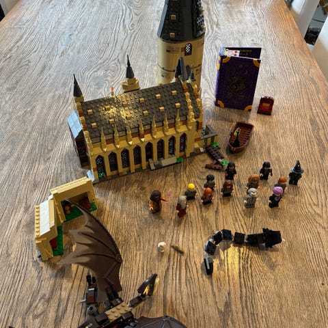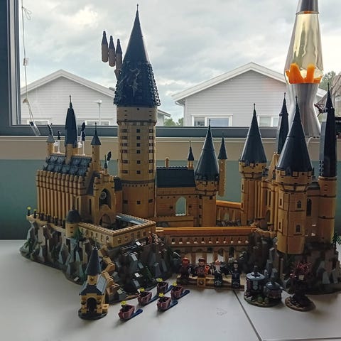 LEGO Harry Potter Hogwarts slott byggesett med flere tårn, klokketårn og tilhørende minifigurer. Settet inkluderer detaljerte bygninger og tilbehør som representerer Hogwarts-skolemiljøet fra Harry Potter-universet.