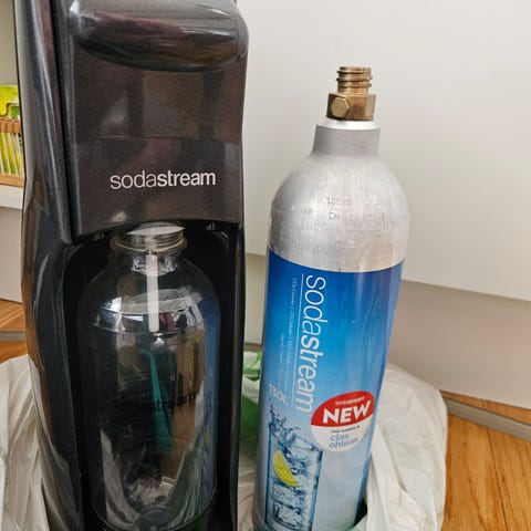 Sodastream, 4 flasker (2x0,5L, 2x1L) og en nestennfull gassflaske selges samlet.