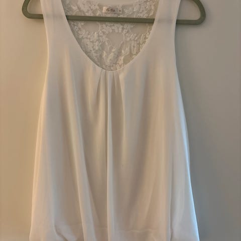 Toppen er i størrelse 38 og designet for dame. Den har gjennomsiktige ermer og dekorative detaljer i ermekantene.