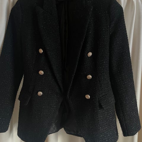 Eksklusiv og statement-preget tweedjakke fra Zara, helt ny og ubrukt. Jakken har et elegant, figursydd snitt med dobbel knepping, rå frynsekant og dekorative gullknapper som gir et luksuriøst uttrykk.
