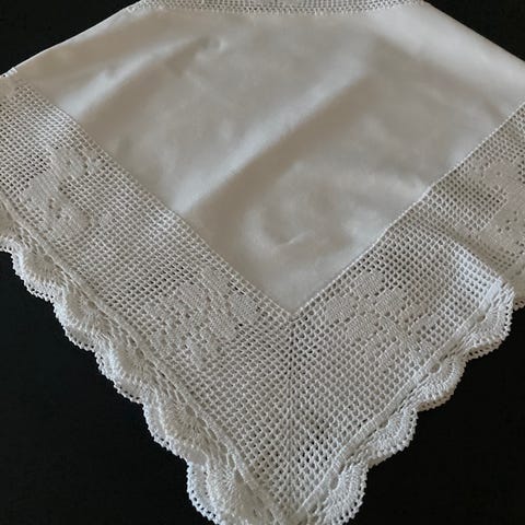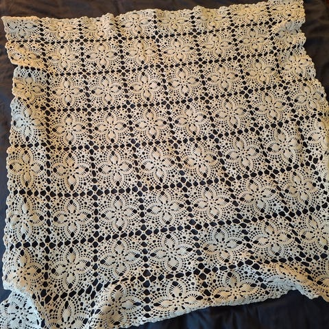 Helt ny heklet duk, i hvitt Solberg mercerisert bomullsgarn 12/3, heklenål 1,25 mm.