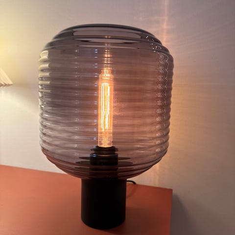 Teak Vegglampe med , glasskuppel i gul farge og messingdetaljer. Lampen har en krok for oppheng og en bryter på siden for enkel betjening. Egnet for innendørs bruk som veggbelysning.