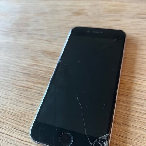 Apple iPhone 6 mobiltelefon med synlige skader på skjerm. Modell er iPhone 6, uten spesifisert minnestørrelse. Fargen er sølv.