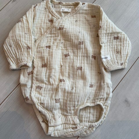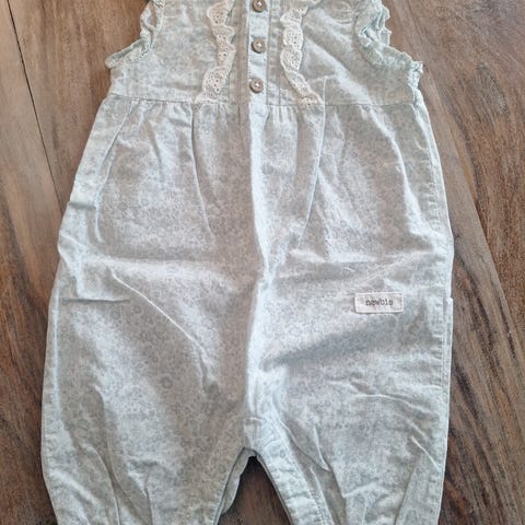 Newbie jumpsuit for jente i størrelse 56. Laget av bomull med flerfarget mønster. Plagget har korte ermer med volanger og knappelukking bak for enkel påkledning.