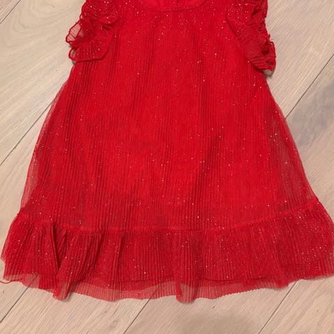 Dyp rød farge, med luftig tyllskjørt og stor dekorativ sløyfe bak. Matchende sko følger med (se bilder).