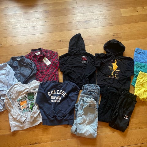 Klespakke til en jente på ca 12 til 14 år. Str 160 til 170, XS. Gensere, skjorte, lue, pajamas selges samlet. Pent brukt. Kan sendes.
