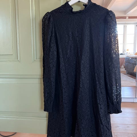 Floyd festkjole i størrelse S, svart farge og materiale med paljetter. Kjolen har et festlig design egnet for formelle anledninger. Ballongarmer, til albuen. Lårkort.