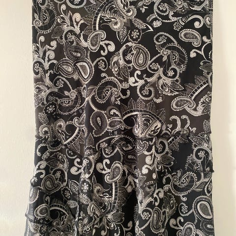 Fint skjørt i Wearhouse, likt mønster bak og framme som skrår litt utover. Lappen ser slitt ut men skjørtet er som nytt. Stoffet er polyester og bomull.