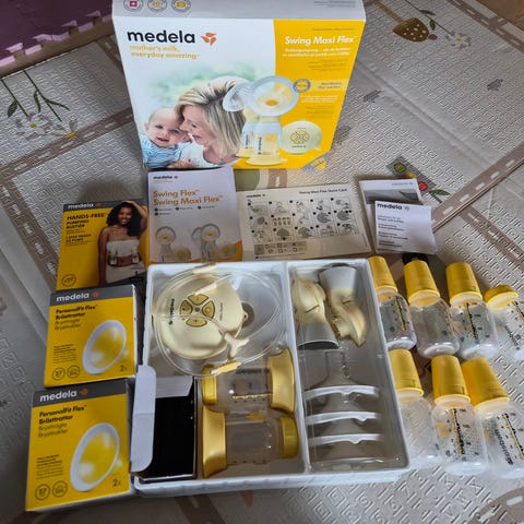 Pent og lite brukt medela swing maxi dobbel brystpumpe. Kan følge med: medela harmony flex manuell brystpumpe, naturebond silikon pumpe, pent brukt pumpeBH fra medela i xl, som gjør at man kan pumpe handsfree. I tillegg til ekstra flasker.