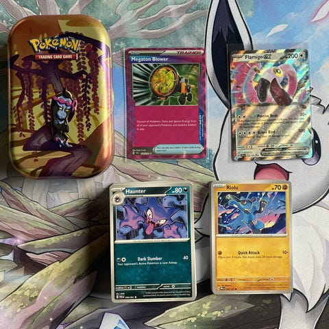 Pokemon Samlekortboks i rød metall. Boksen er designet for oppbevaring av Pokemon-kort og har et motiv med Pokemon-figurer på lokket.