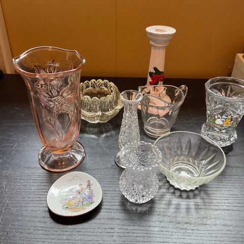 Dekorativ vintage lysestake i messing med emaljert fat i rosa/terracotta og grønne toner. Klassisk chamberstick-form med lite håndtak. Fin som stemningslys eller dekor i både retro og moderne interiør.