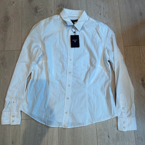 GANT skjorte i blå farge, laget av bomull. Skjorten har lang erm, slim fit, polokrage og ribbestrikkede mansjetter. Den har knapper av imitert perlemor og et lite GANT-logo brodert på brystet. Str xxl, men føler den er mer en M/L alt etter hvilken passform man foretrekker😊
