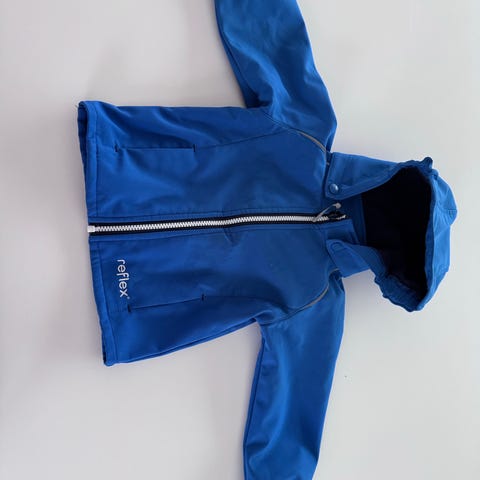 Reflex sett størrelse 80. Meget pent brukt av ett barn. Settet består av jakke og bukse i blå farge. Jakken har hette og glidelås, og praktisk åpning i rygg. Buksen har justerbare seler og refleksdetaljer for økt synlighet.