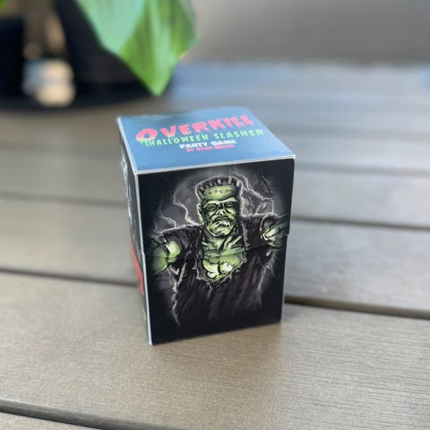 Biljardspill i tre med grønn spilleflate. Inkluderer to køer og flere fargede brikker i gult, grønt, rødt og hvitt. Spillet har et kvadratisk brett med hull i hjørnene for poengsamling.