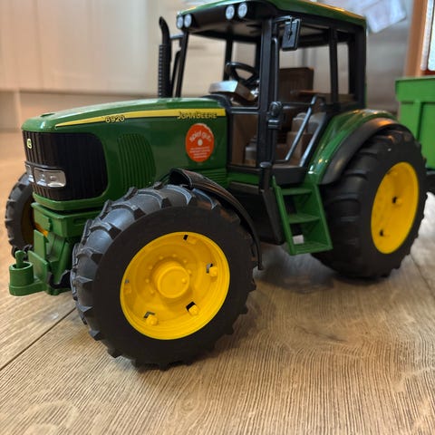 Stor Rød vintage plast traktor med gule hjul og ratt. Modellen inkluderer en førerfigur. Traktoren er laget i plastmateriale og har en enkel design.