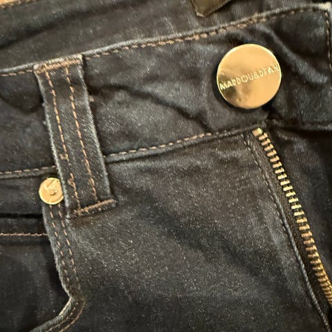 Selger billig fordi det er noen strekkmerker, de selvfølgelig forsvinner, altså strekker seg ut når man tar buksen på seg.