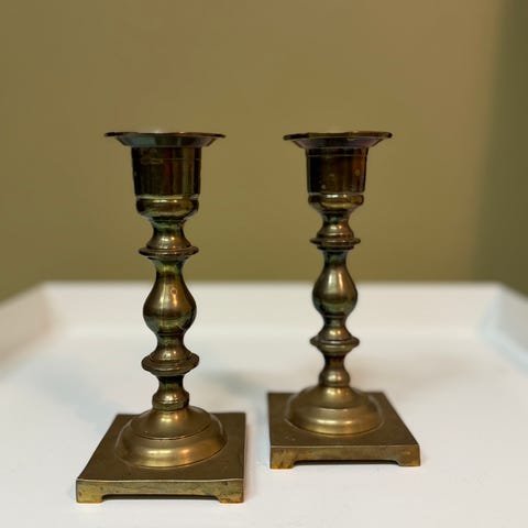 Pent par høye lysestaker i messing med dryppskål. Elegant og tidløs design som passer både klassisk og moderne interiør. Slank form og fin høyde gjør dem svært dekorative på bord, skjenk eller peishylle.