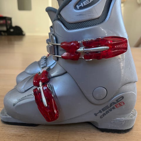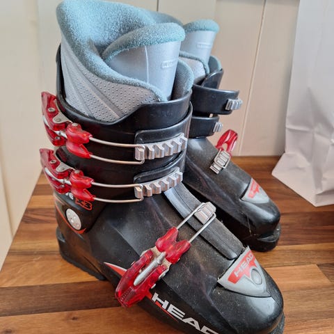 Head ST alpinstøvel i størrelse 24,5. Støvelen har fire spenner og justerbar stropp for god passform. Fargen er hovedsakelig sølv med røde og svarte detaljer. Innvendig foret med polstring for komfort.