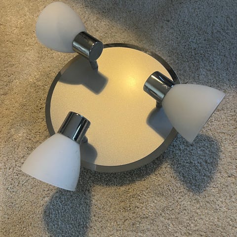 Diameter sokkel 24 cm. Sølv kupler i frostet glass. Med skinne for takfeste.