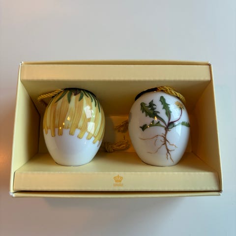 Nydelige, doble påskeegg «Kornblomst blomst og kronblad» i porselen fra Royal Copenhagen fra 2024, selges.