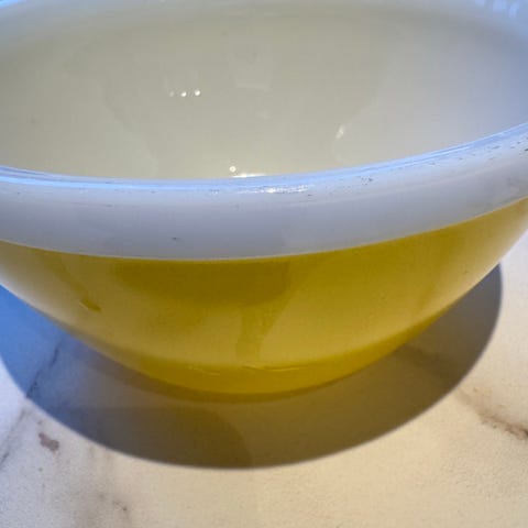 Dette er en vintage JAJ Pyrex bolle fra England med "Rosehip" (rozenbottel) mønster fra 1960-tallet.