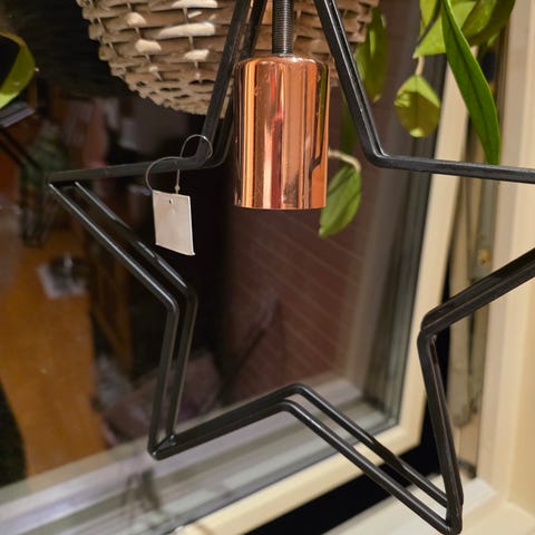 Gammel taklampe med 6 armer, i massiv treverk, fine utskjæringer selges 2000 kr