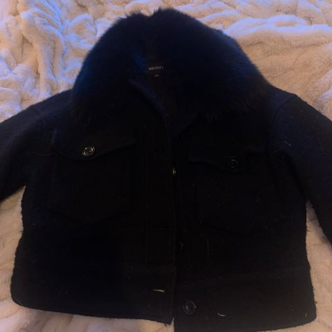 Elegant og tidløs Meotine Marte Jacket selges. Kåpen er kort, dobbelspent med belte og avtagbar pelskrage – brukt kun én gang og i meget god stand.