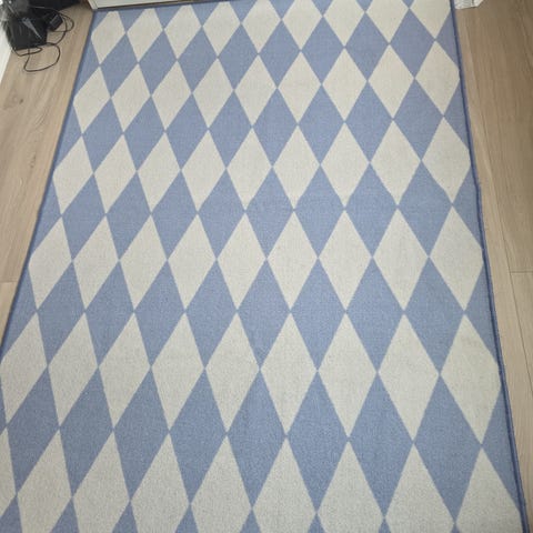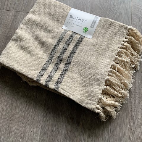 Jysk teppe i størrelse 130x170 cm, laget av bomull. Tilgjengelig i fargene rosa og grønn. Teppe med frynser, egnet for bruk som dekorativt gulvteppe eller pledd.