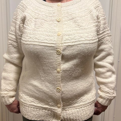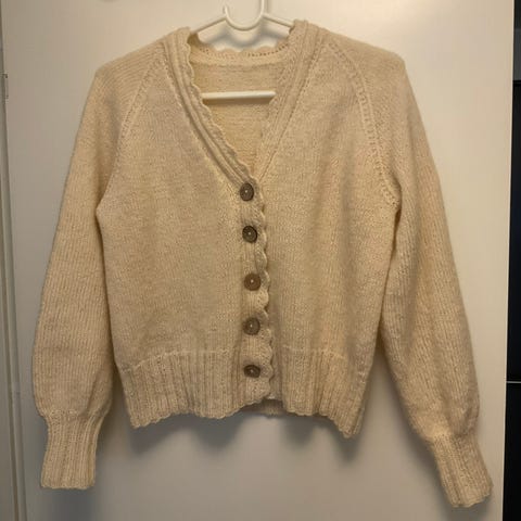 Cardigan i 100% ull, hjemmestrikket i fargen natur. 7 knapper følger løst med. Kan evt monteres for 150 kr