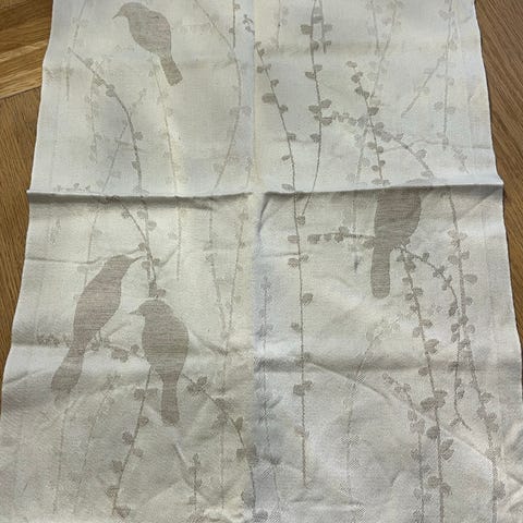 Kromgul linduk med orange innvevd mønster fra 70 tallet. Ingen slitasje men har fjernet stearin med strykejern og trekkpapir, vasket på 60°C og strøket. All stearin er fjernet, men ser det er svake merker som vil forsvinne etter noen flere vask. Flott duk som passer til 70 tallets teak-bord . Kan sende med PostNord til kr.69.‐ eller Norgespakke til kr.76.- Betaling med Vipps.