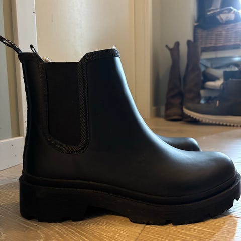 & Other Stories støvlettene er i størrelse 41. Fargen er svart, og materialet er semsket skinn med litt foring inni. Glidelås på begge sider. Støvlettene er designet for kvinner. Er aldri brukt kun prøvd. Må hentes eller kan sendes mot betaling fra kjøper
