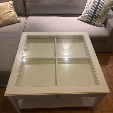 Pent sofabord med topplate av glass. Under topplaten er det en skuffe som er indelt i 4 like rom.