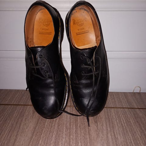 Skoene ble kjøpt i London i år 2000 og er i sort semsket skinn. Skoene er pent brukt, tatt godt vare på, er i god forfatning og har ikke vært brukt på rundt 15-16 år.