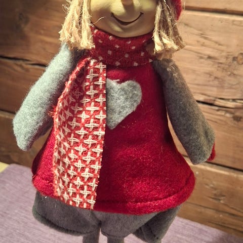 Søkeord nissejente nisse jenta grå lue rød kjole filt håndlaget julepynt 30 cm høy julenisse figur dekor rød kjole hvit skjegg bånd vintage retro samleobjekt gave jul hytte sommerhus brukt finn tise epla etsy facebook nissejenta julefigur håndlaget nisse grå hatt rød dress