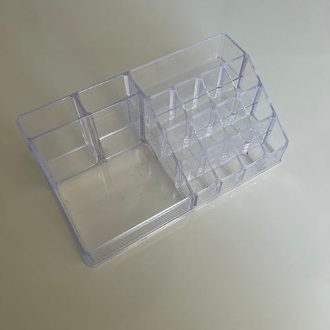 Roterende oppbevaring i svart plast med flere oppbevaringsrom. Designet for å organisere sminke på en praktisk måte.
