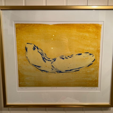 Rolf Nesch grafikk kunsttrykk i ramme. Signert og nummerert utgave 25/150. Abstrakt motiv med farger i grønt, oransje og svart. Passer til dekorasjon i hjem eller kontor.