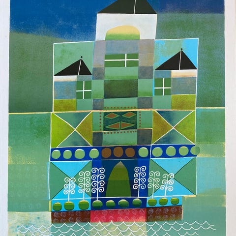 L. P. Hips Hippie kunsttrykk fra 1981-82. Bildet viser et fargerikt motiv med abstrakte elementer og en person i midten. Kunsttrykket er innrammet med en enkel ramme og signert av kunstneren.