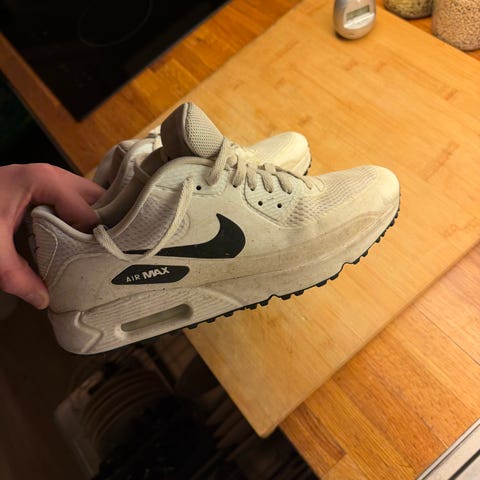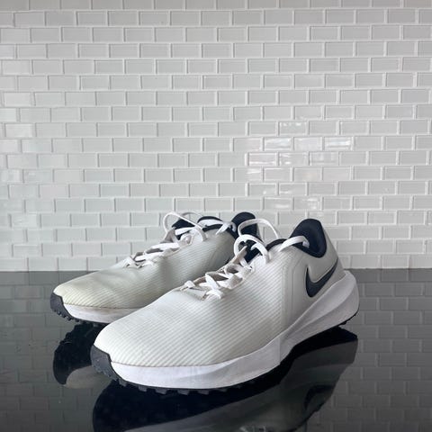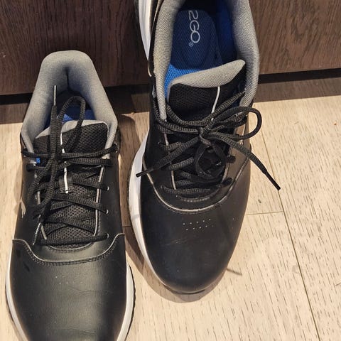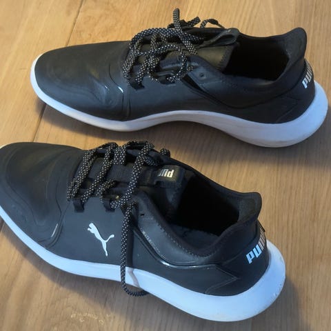 Nesten ubrukte Puma golfsko i klassisk hvit design med sorte detaljer. Skoene sitter godt på foten og gir god støtte og stabilitet, perfekt både til golfbanen og driving range. Komfortabel passform og lett konstruksjon gjør dem behagelige å bruke over lengre tid.