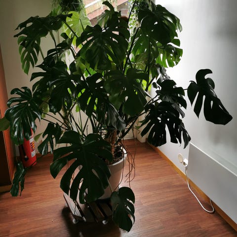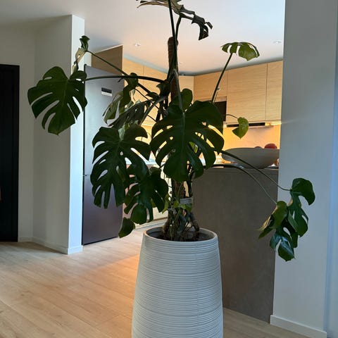 Monstera Deliciosa stueplante med store grønne blader. Egnet som dekorativ plante i hjemmet eller kontormiljø. Krever moderat lys og regelmessig vanning.