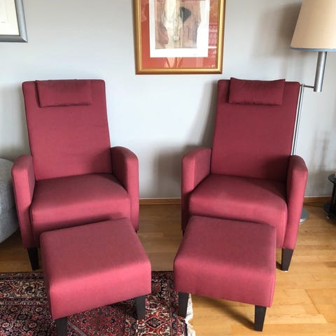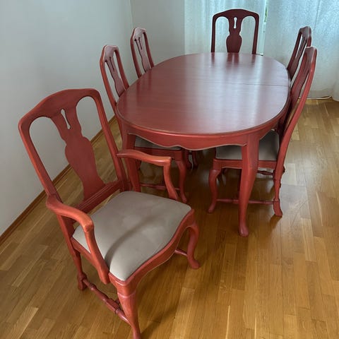 10 stk stoler i godt stand, passer godt til hytte. Bonderød med trekk. Helt og fint