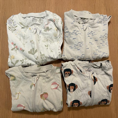 Pysjene er laget i et mykt og behagelig stoff av bambusviskose og bomull, har ingen irriterende sømmer eller stikkende etiketter. Romslig i størrelsen og fin å vokse i - vi brukte de helt til str 98. Pysjene har også nedbrettbare «sokker» for kalde tottiser.
