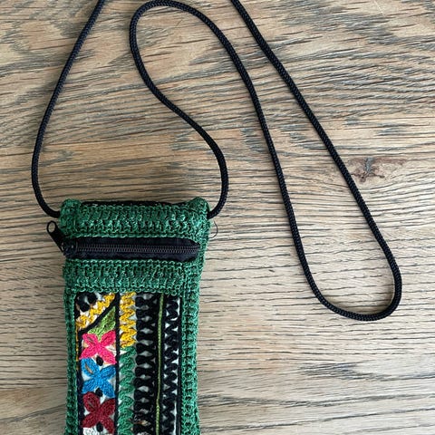 Veske i stoff for dame med brodert mønster og dekorative paljetter. Vesken har en lang stropp, egnet for å bæres over skulderen eller som crossbody.størelse 8x13cm